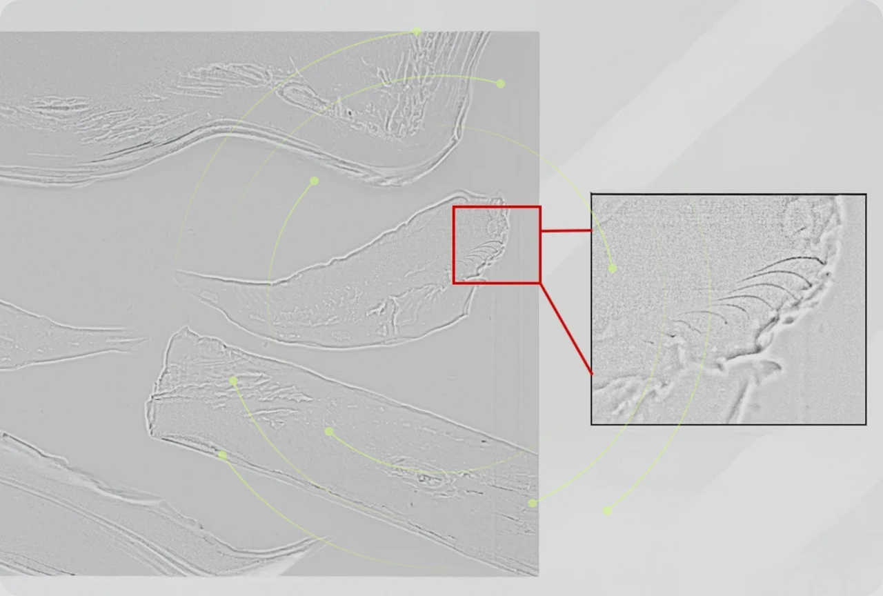 • Pomocou špeciálneho algoritmu spracovania obrazu dosahuje veľmi dobré výsledky detekcie rybej kosti a kosti.